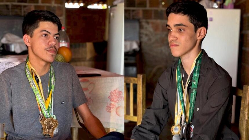 Os destacados na foto são os Cícero Davi (à esquerda) e José Willyan (à direita) que tiveram as maiores notas da rede estadual do Ceará na OBMEP 2025.