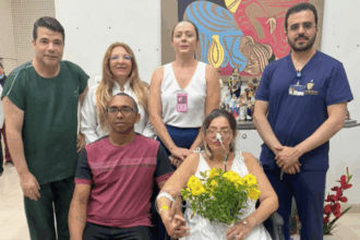 A paciente Thea Doug, de 44 anos, que vivenciou a celebração do…