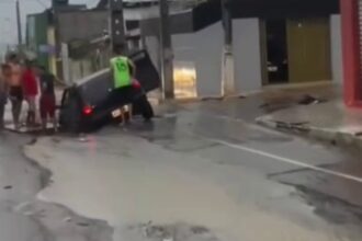 Um carro ficou preso após o asfalto ceder no bairro Frei Damião,…