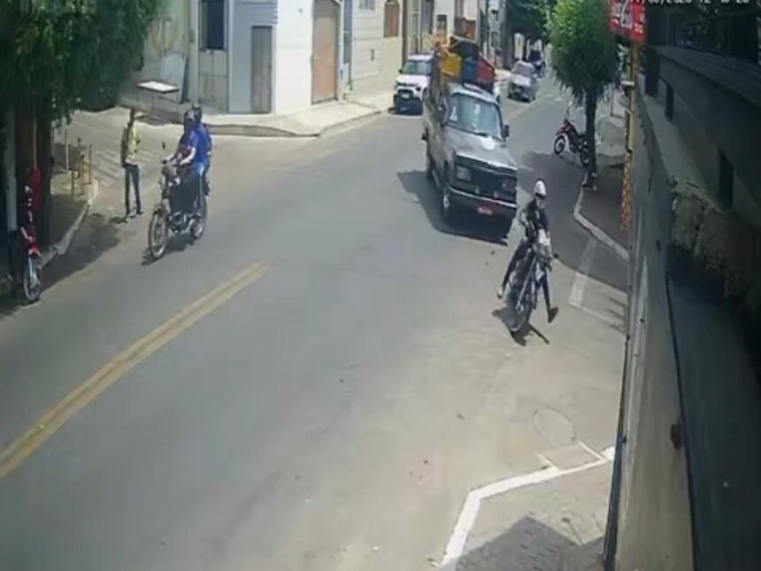 Câmeras de segurança registraram a colisão. Ninguém ficou ferido, e o motociclista foi ajudado por pessoas que estavam no local a retirar a moto de dentro da padaria.